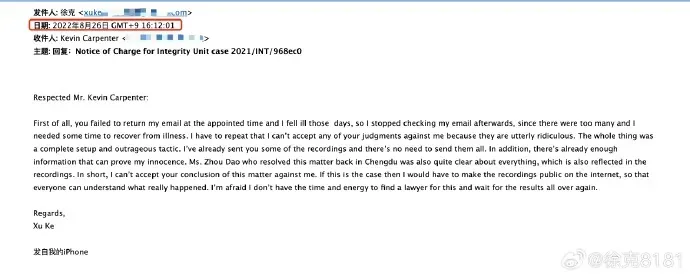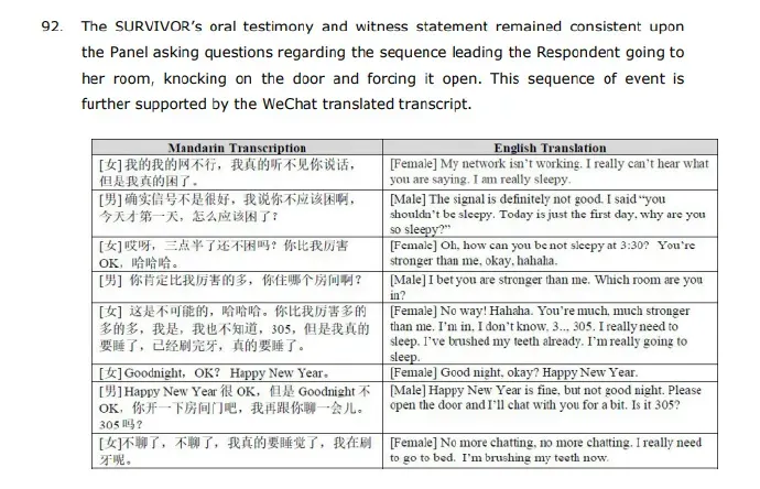 国际乒联在官方公告中写道:事件发生在2021年1月1日凌晨,当时徐克在成都的国际训练营中邀请四名球员到他的房间喝酒庆祝新年。随后,受害者(一名美国队女队员)回到自己的房间后,徐克通过微信获取了她的房间号,并在未经允许的情况下强行进入她的房间,实施了性侵行为。具体行为包括拥抱并将手伸入受害者的裤子中,尽管受害者明确表示拒绝。国际乒联的调查基于受害者的陈述以及双方的聊天记录。聊天记录显示,徐克主动询问受害者的房间号,并在对方表示要睡觉的情况下,仍然坚持进入房间“再聊一会儿”。此外,裁决提到,徐克的行为严重违反了国际乒联的反骚扰政策,且调查过程中未发现徐克提供的有效证据来反驳指控。