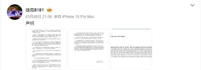 北京时间3月9日,因涉嫌性骚扰被禁赛10年的乒乓球教练、田志希丈夫徐克发布声明,称之前的裁决严重颠倒事实。