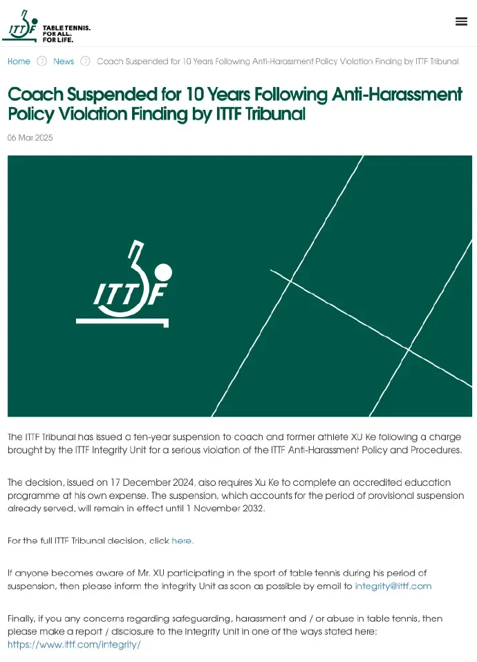 北京时间3月6日,国际乒联官方发布一则禁令。禁令中称,一名名叫XU KE的教练员兼前运动员,严重违反了ITTF反骚扰政策而被停职10年。