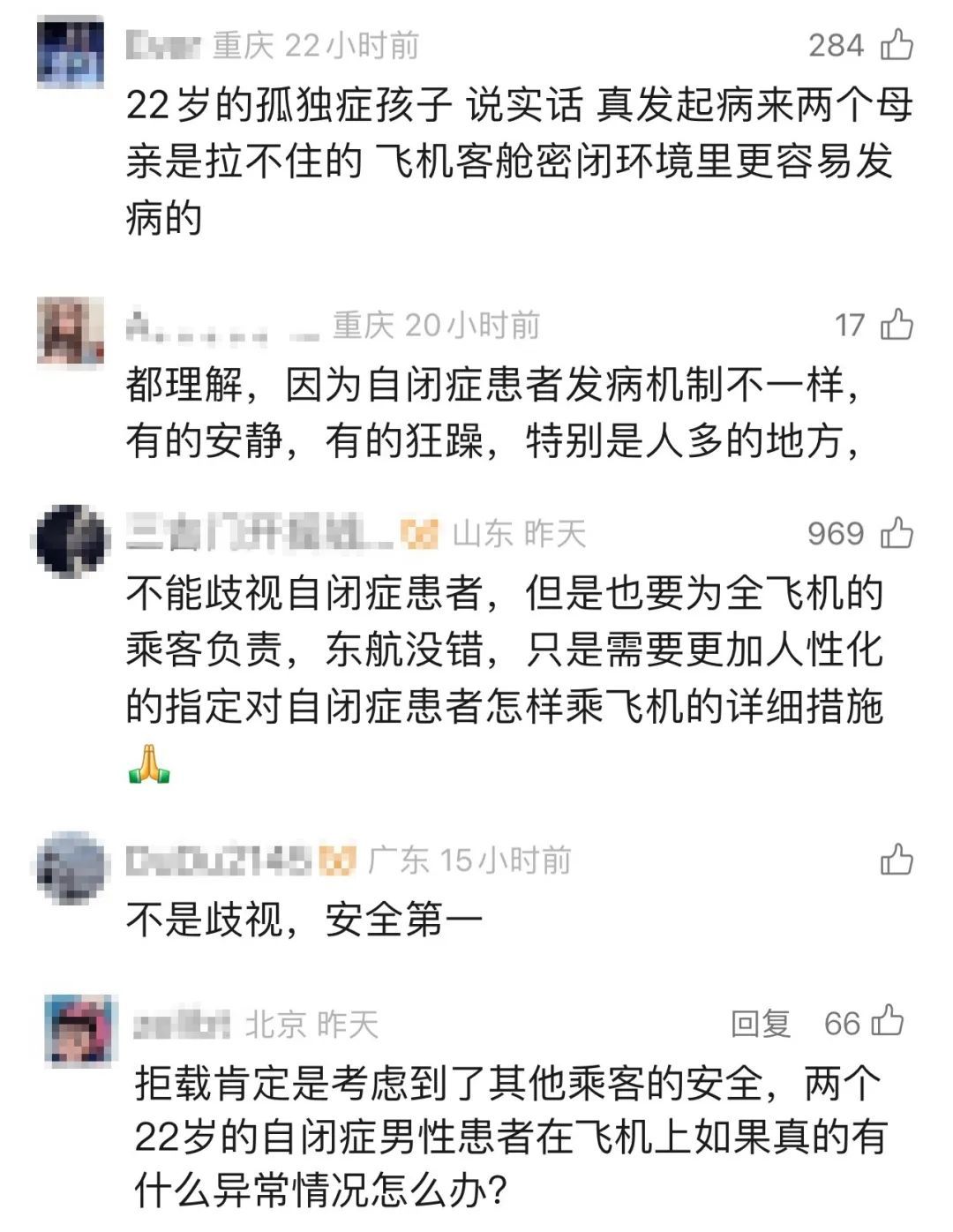 他提出,若孤独症患者出现如自伤、攻击他人、突发精神症状等明确危害安全的行为时,则可依法拒载,“航空公司需在拒载前进行专业评估,确认患者行为是否可能危害安全或造成不便。若仅凭家长提供的医学证明拒载,则缺乏充分依据。”他认为,航空公司应建立专业评估机制,结合医学评估、行为观察及无障碍服务需求综合判断,同时加强员工培训,提升服务意识。