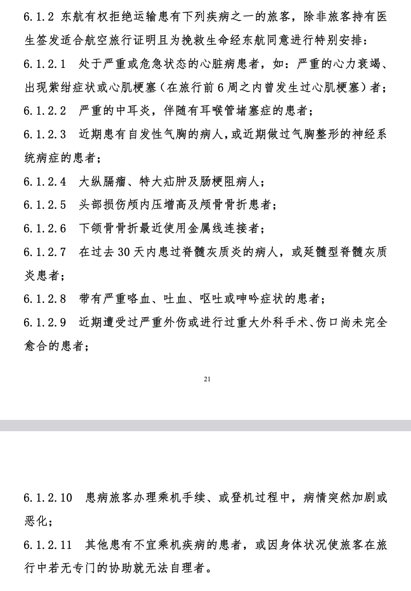 《中国东方航空股份有限公司旅客、行李运输条件》显示,东航有权拒绝运输患有下列疾病之一的旅客,除非旅客持有医生签发适合航空旅行证明且为挽救生命经东航同意进行特别安排(详见下图)。照此看,孤独症人士通常情况下不在航司的拒载范围。