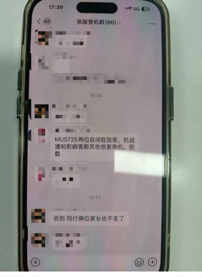 登机时间临近,他们才被告知,孩子被拒载了。工作人员展示了“旅服登机群”内由“大理机场地服生产调”发送的一则消息,“MU5725两位孤独症旅客,机组通知影响客舱其他旅客乘机,拒载”。
